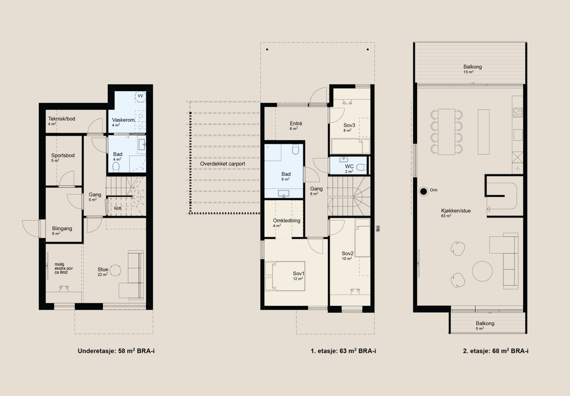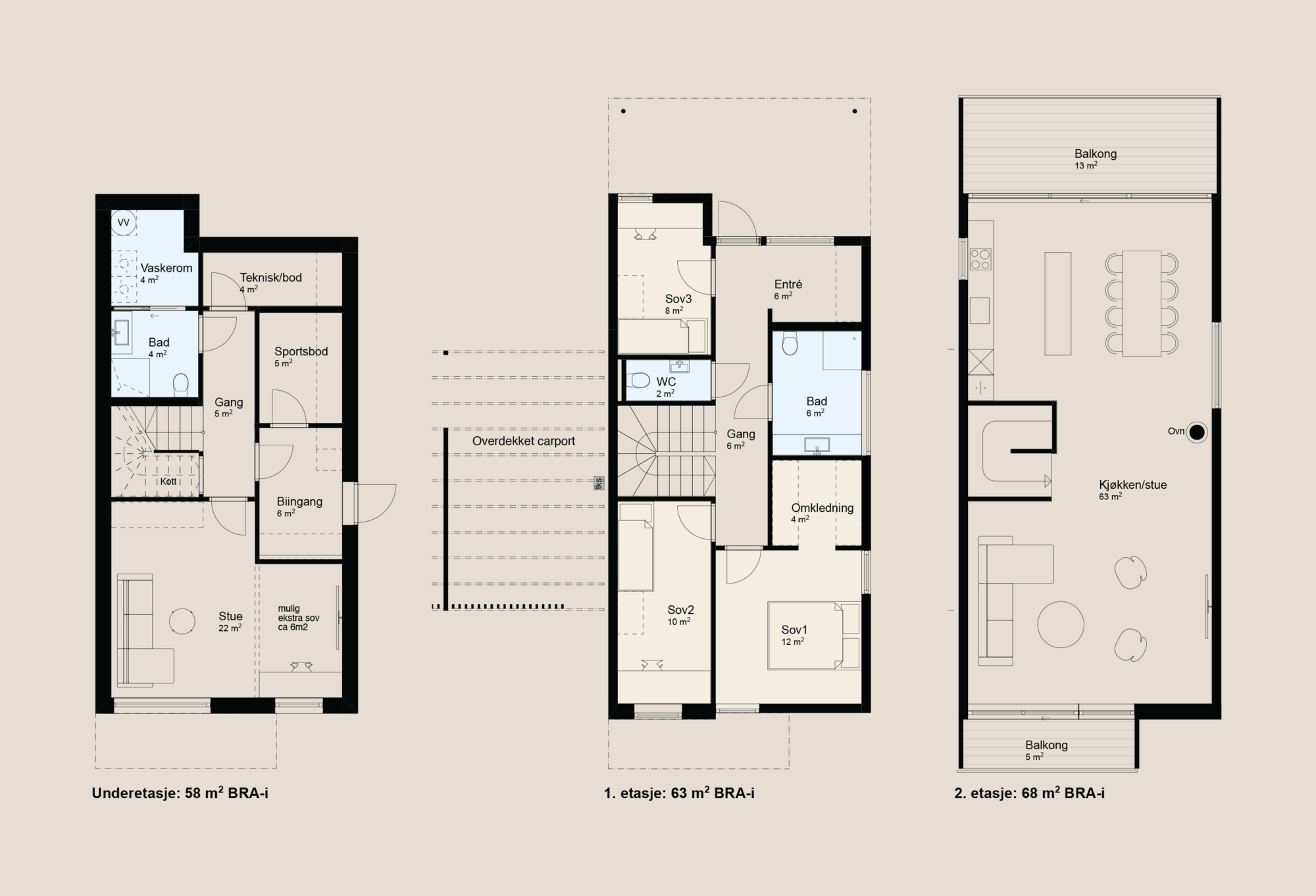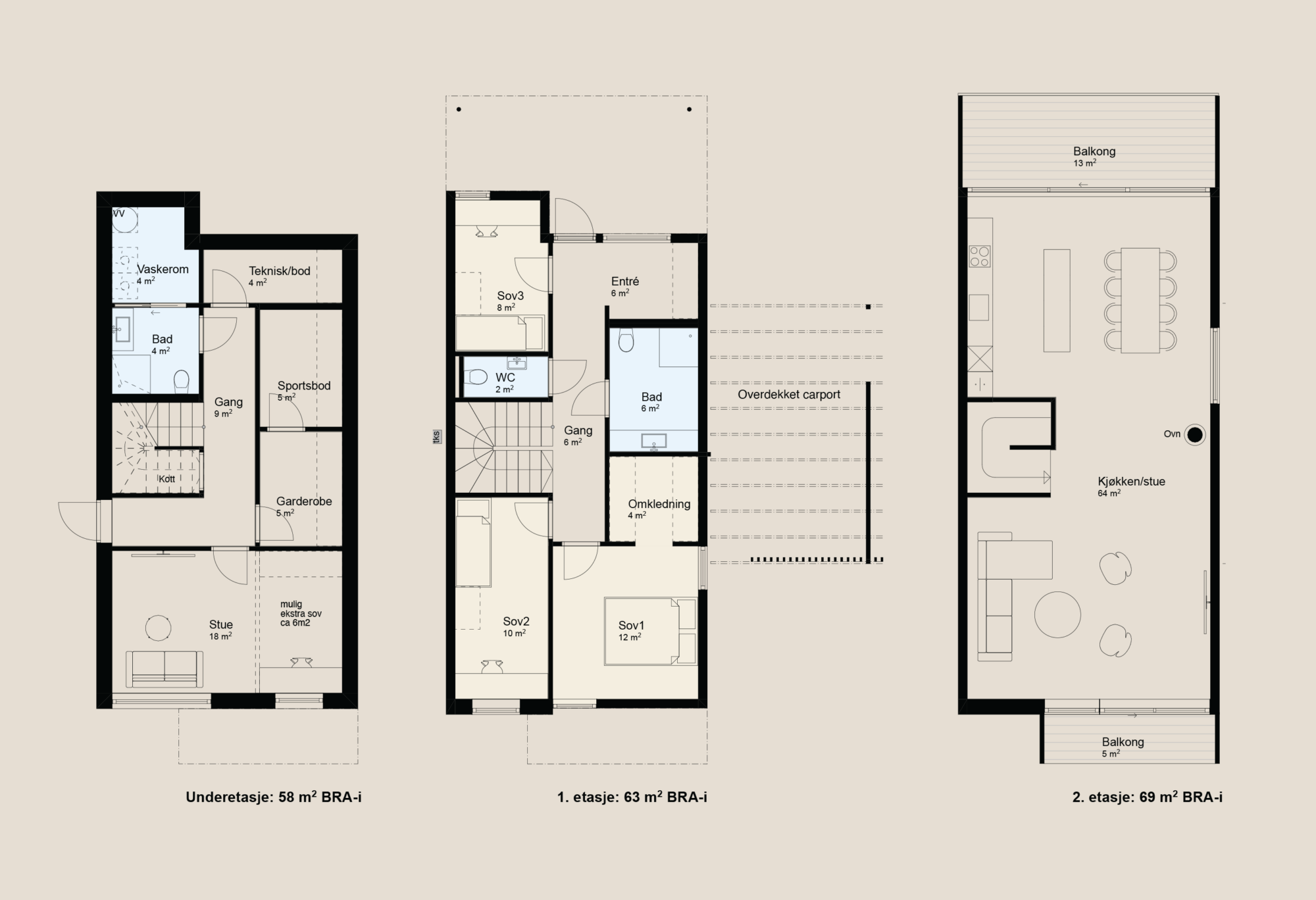 I første etasje ligger entréen med gang, bad, WC og 3 soverom, hvor ett av disse har walk-in closet. Det er mulig å lage et ekstra soverom i denne etasjen. I øverste etasje ligger stue og kjøkken i en åpen løsning. Her er det utgang til to terrasser – en på hver side av huset. I underetasjen er det en praktisk bi-inngang, teknisk bod, vaskerom, sportsbod, bad og en ekstra stue. Om ønskelig kan en bygge hybel i underetasjen mot et tillegg i pris – en unik mulighet for gode leieinntekter.